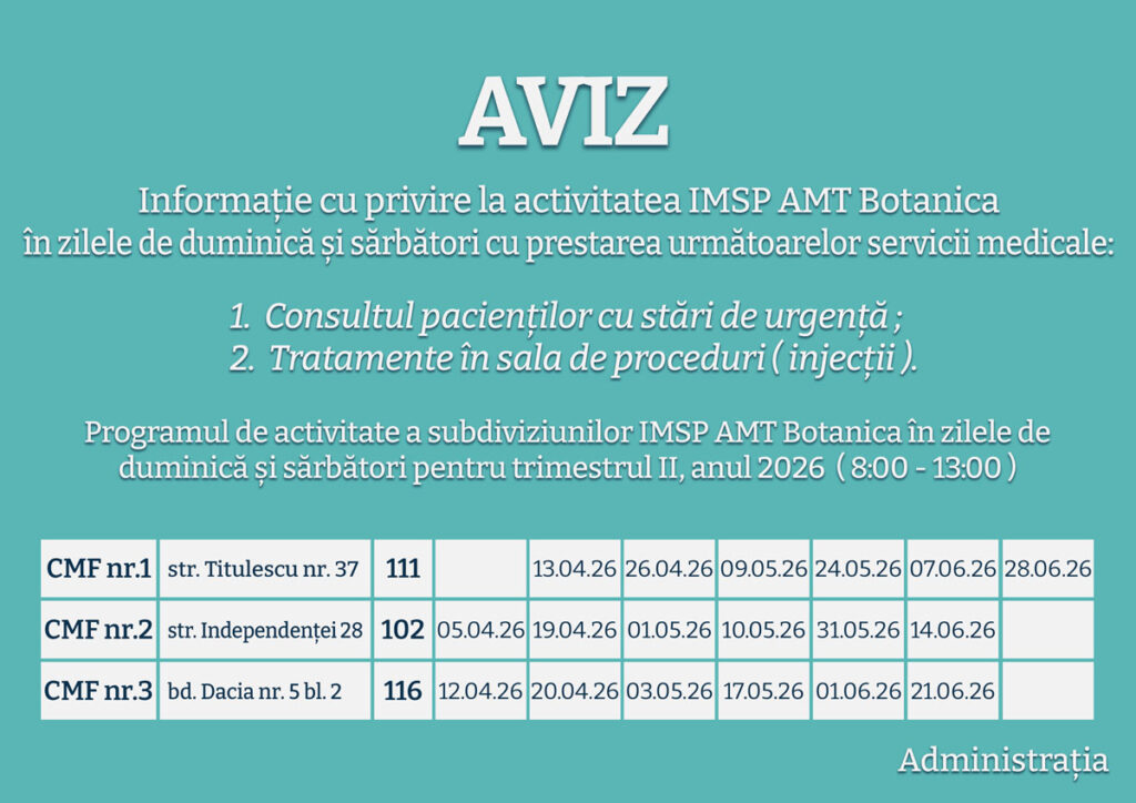 Instituția Medico - Sanitară Publică AMT Botanica, în baza contractului de acordare a asistenței medicale (de prestare a serviciilor medicale) în cadrul asigurărilor obligatorii de asistență medicală , prestează următoarele tipuri de servicii medicalele: